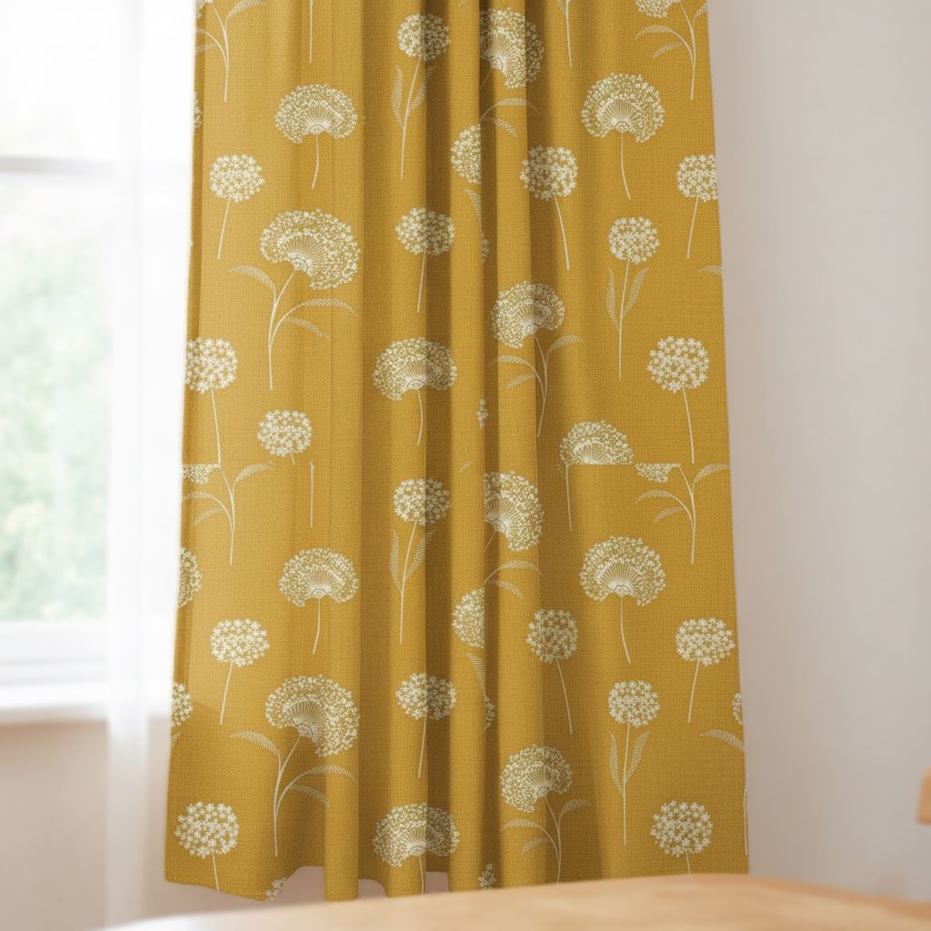 Κουρτίνα μουστάρδα με λουλουδάτο σχέδιο πικραλίδας.