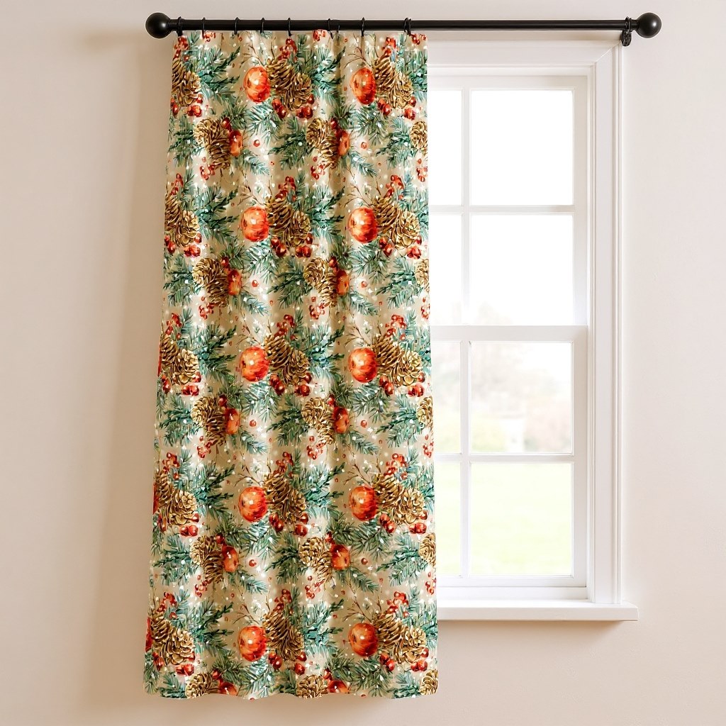 Οι εποχιακές κουρτίνες από καραβόπανο προσφέρουν μια γιορτινή αίσθηση στο χώρο σας με το ζωηρό σχέδιο από κουκουνάρια και κόκκινες μπάλες. Κατασκευασμένες από ανθεκτικό καραβόπανο, είναι ιδανικές για εσωτερική χρήση, προσφέροντας μια ζεστή και κομψή ατμόσφαιρα. Οι χριστουγεννιάτικες αποχρώσεις πράσινου και κόκκινου δημιουργούν μια εορταστική διάθεση, κάνοντας την κάθε γωνία του σπιτιού σας να λάμπει.