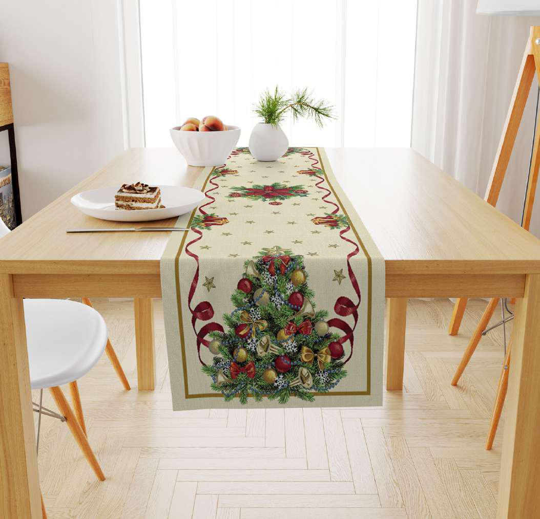 Χριστουγεννιάτικο ράνερ με διαστάσεις 47×140 εκ. από ύφασμα Στόφα, ιδανικό για να διακοσμήσετε το τραπέζι σας με γιορτινή διάθεση. Το σχέδιο περιλαμβάνει ένα εντυπωσιακό χριστουγεννιάτικο δέντρο με πολύχρωμες μπάλες, κόκκινες κορδέλες και χρυσά αστέρια, προσδίδοντας ζεστασιά και χαρά στον χώρο σας. Το ανθεκτικό υλικό του το καθιστά ιδανικό για καθημερινή χρήση, ενώ παράλληλα ενισχύει την αισθητική του τραπεζιού σας.