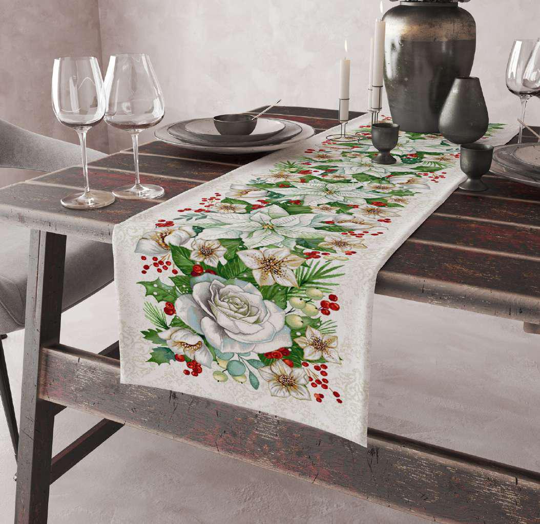 Δημιουργήστε μια γιορτινή ατμόσφαιρα με το Χριστουγεννιάτικο ράνερ διαστάσεων 47×140 εκ. Το σχέδιο του διαθέτει λευκά λουλούδια και πράσινα φύλλα, εμπλουτισμένα με κόκκινες μπαλίτσες, δημιουργώντας ένα μαγευτικό και ζεστό αποτέλεσμα. Ιδανικό για να προσθέσετε μια κομψή πινελιά στο χριστουγεννιάτικο τραπέζι σας, το προϊόν συνδυάζει την αισθητική με την πρακτικότητα.