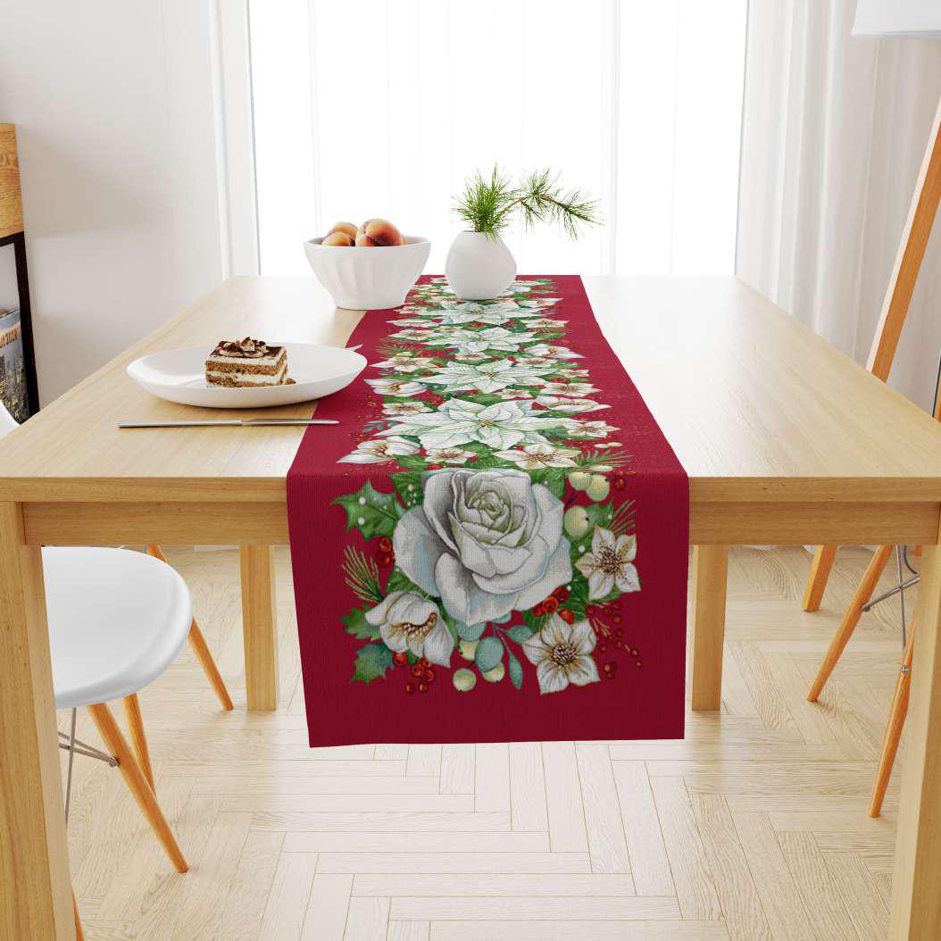 Ανακαλύψτε το ιδανικό χριστουγεννιάτικο ράνερ για να διακοσμήσετε το σπίτι σας αυτές τις γιορτές. Με μέγεθος 47Χ140 εκ., αυτό το ράνερ στόφα είναι διακοσμημένο με εντυπωσιακά λευκά τριαντάφυλλα και πράσινα φύλλα σε κόκκινο φόντο, προσθέτοντας ζεστασιά και κομψότητα στο τραπέζι σας. Η υψηλή ποιότητα του υφάσματος στόφας εξασφαλίζει αντοχή και διαχρονικότητα, καθιστώντας το ιδανικό για χρήση σε κάθε χριστουγεννιάτικη περίσταση.