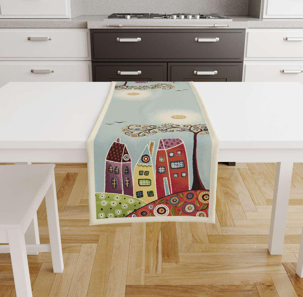 Το χριστουγεννιάτικο ράνερ με μέγεθος 47Χ140 εκ. από Στόφα προσφέρει μια εντυπωσιακή προσθήκη στο τραπέζι σας. Το πολύχρωμο σχέδιο με σπίτια και δέντρα, σε αποχρώσεις του κόκκινου, πράσινου και μπεζ, δημιουργεί μια ζεστή, φιλόξενη ατμόσφαιρα. Κατασκευασμένο από ύφασμα ανθεκτικό για εσωτερική χρήση, προσφέρει αντοχή και ποιότητα.