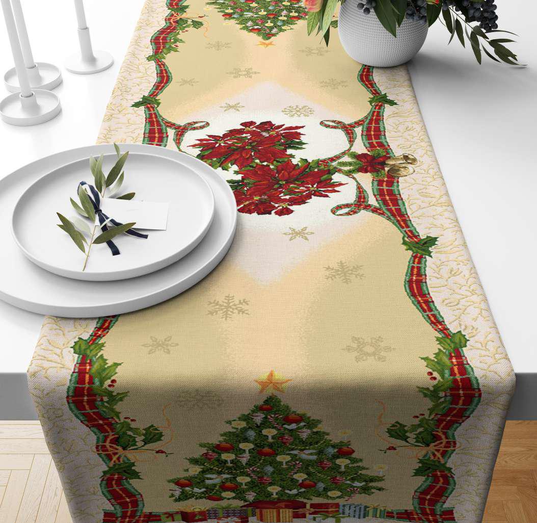 Το χριστουγεννιάτικο ράνερ Στόφα, με μέγεθος 47×140 εκ., προσφέρει μια ζεστή και εορταστική ατμόσφαιρα στον χώρο σας. Το σχέδιο του περιλαμβάνει όμορφα μοτίβα με χριστουγεννιάτικα δέντρα και αλεξανδρινά σε πράσινες και κόκκινες αποχρώσεις, εμπλουτίζοντας το τραπέζι σας με γιορτινή διάθεση. Ιδανικό για το χριστουγεννιάτικο τραπέζι ή το καθιστικό σας.
