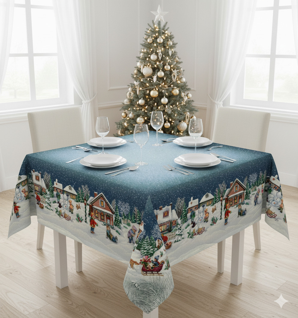 Το Χριστουγεννιάτικο τραπεζομάντηλο Στόφα είναι ιδανικό για τη διακόσμηση των γιορτινών σας στιγμών. Κατασκευασμένο από βαμβάκι υψηλής ποιότητας με προσθήκη πολυεστέρα, το ύφασμα του είναι ανθεκτικό και βαρύ, καθιστώντας το ιδανικό για χριστουγεννιάτικες συγκεντρώσεις. Το σχέδιο του τραπεζομάντηλου συνδυάζει όμορφα χιονισμένα τοπία και παραδοσιακά χριστουγεννιάτικα μοτίβα σε αποχρώσεις του μπλε και λευκού, προσφέροντας μία αίσθηση ζεστασιάς και παράδοσης.